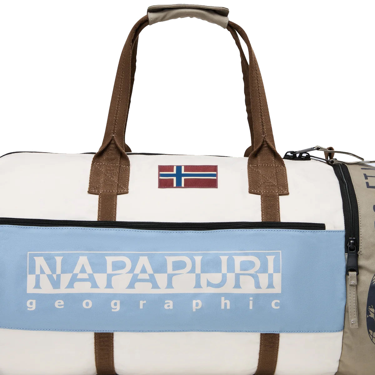 Borsone Equator 61 Lt Light Beige Napapijri, versatile e spazioso accessorio viaggio realizzato in resistente cotone. Design vintage, con loghi, patch applicati e stampa d'archivio GPS-ET Mapping Survey. Dotato di doppi manici superiori, manichetto laterale, tasche esterne con cerniera e tracolla regolabile. Ampio comparto con chiusura con zip bidirezionale, interno foderato e completo di taschino