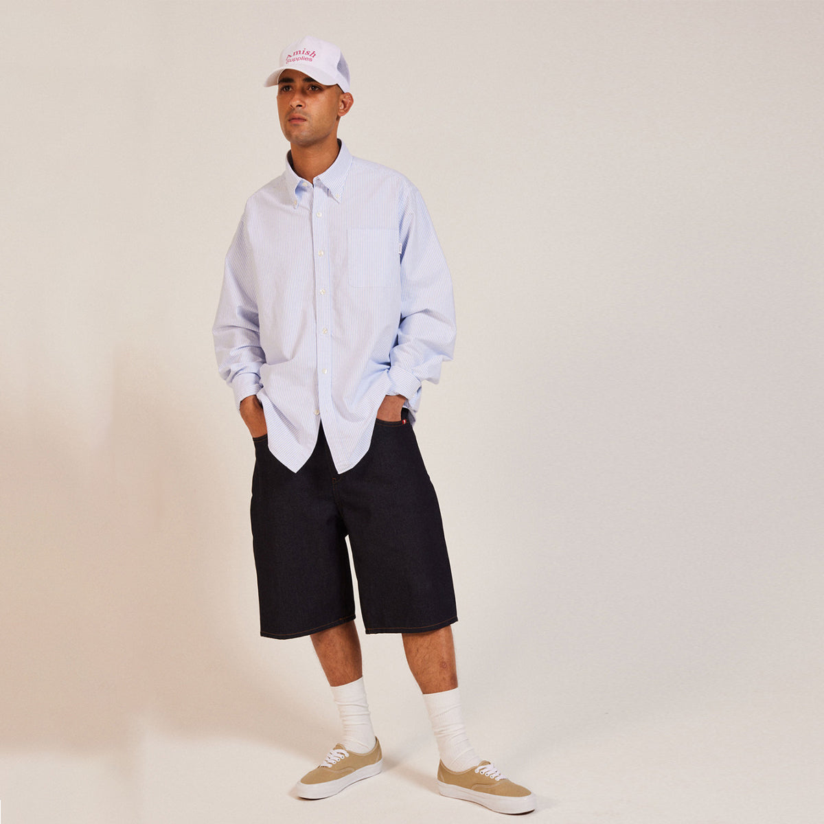 Camicia America Oxford Stripe White Sky Amish, modello in puro cotone con motivo a righe. Colletto classico, chiusura con bottoni e tasca piatta sul petto.