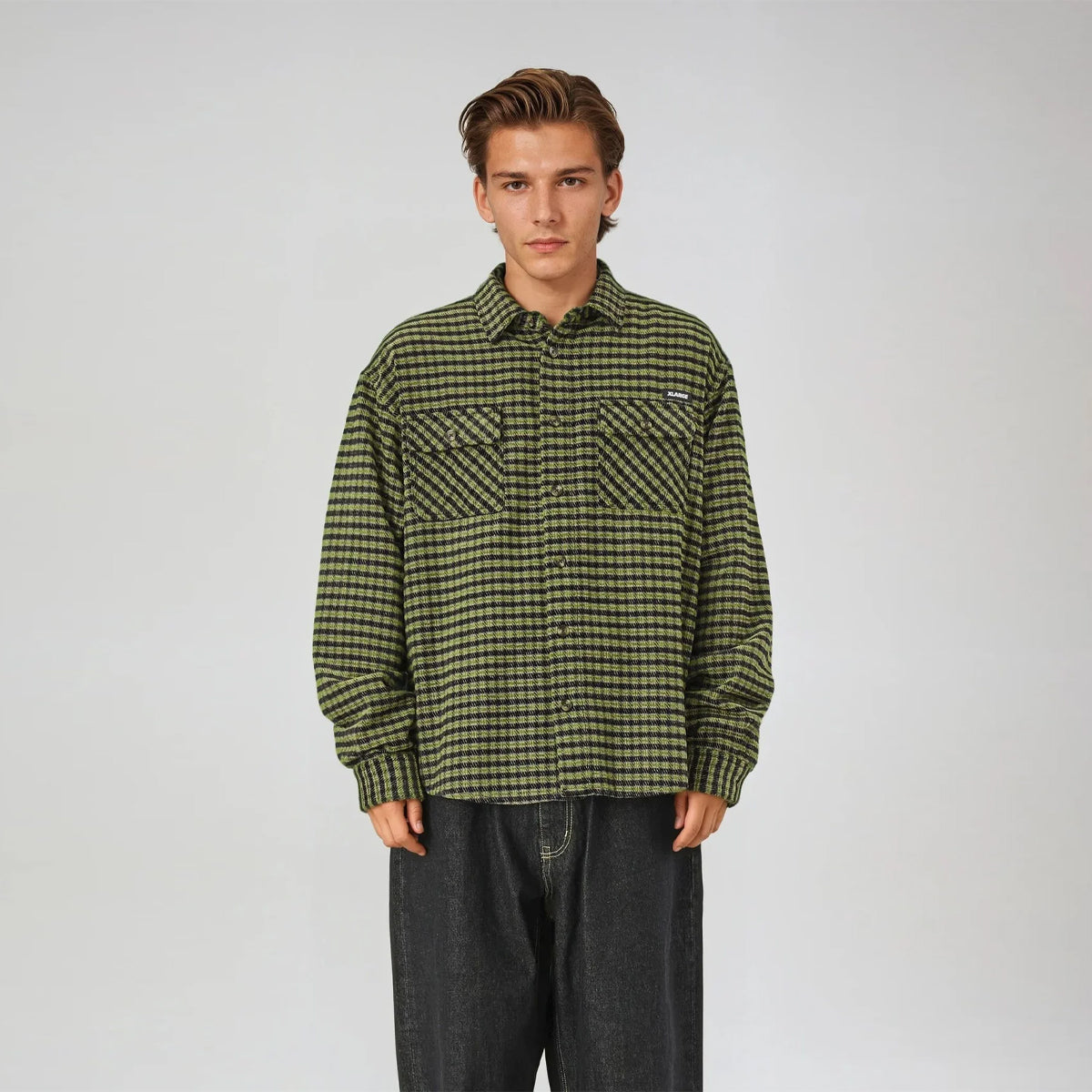 Camicia Plaid Black Xlarge, accessorio in robusto tessuto policotone con fantasia a quadri. Chiusura con bottoni, tasche sul petto e label intessuta con logo.