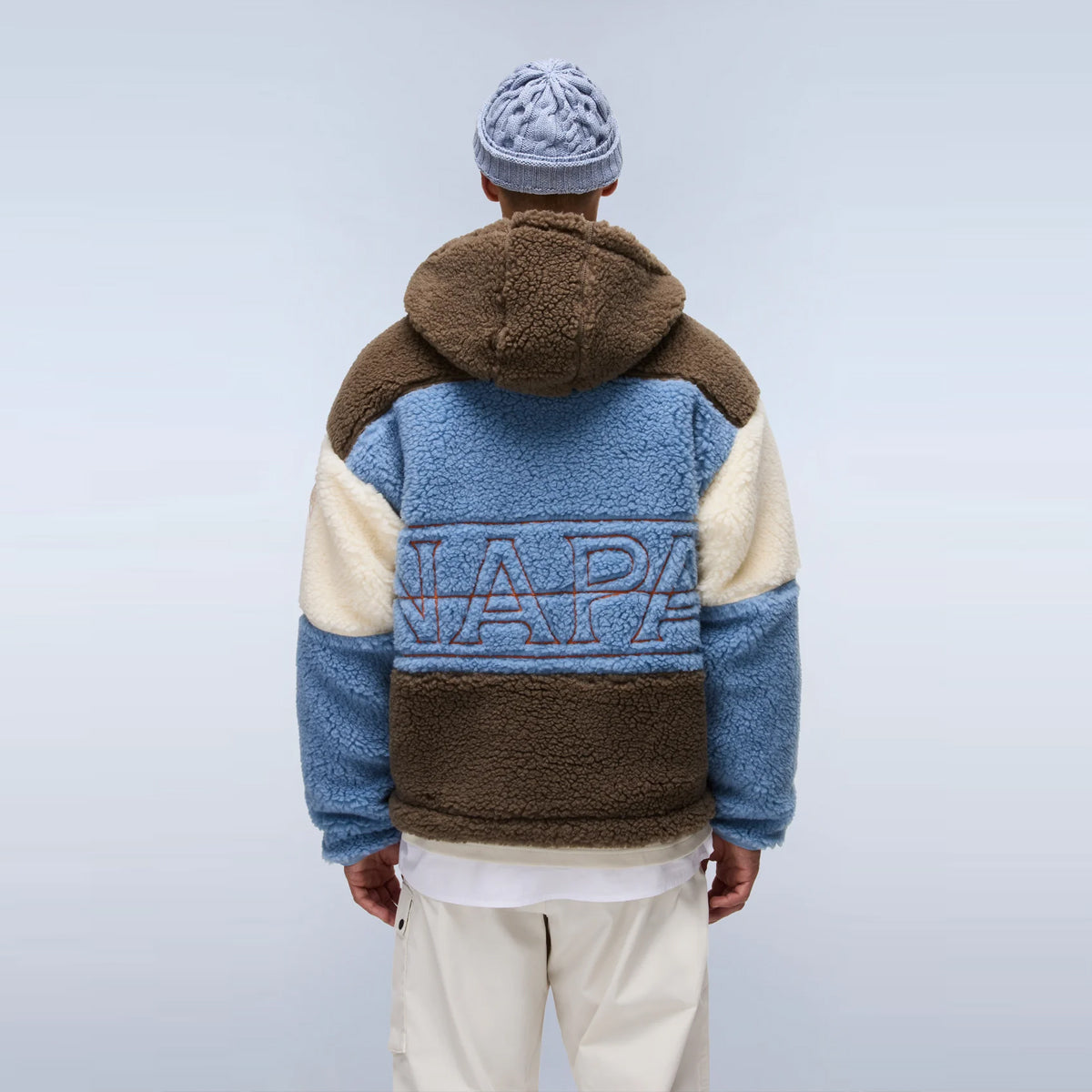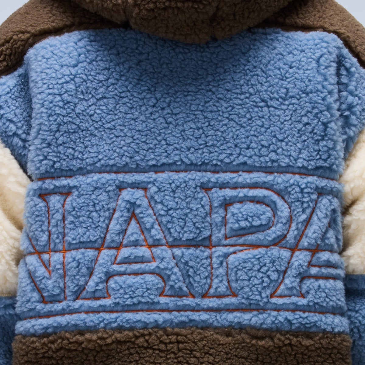 Felpa in pile Tires Light Blue Napapijri, morbida e calda felpa con cappuccio ispirata alle spedizioni outdoor, dalla vestibilità oversized. Realizzata in tessuto sintetico e lana, con orlo e cappuccio regolabile e staccabile, chiusura con zip bidirezionale a tutta altezza, stemmi e dettagli ricamati.