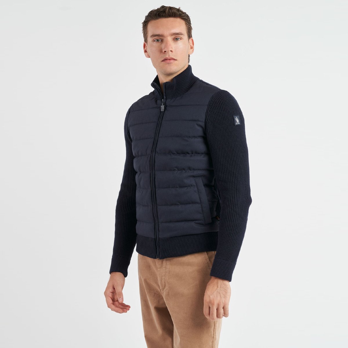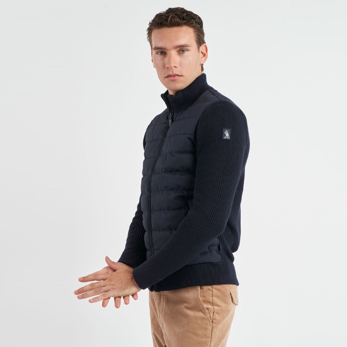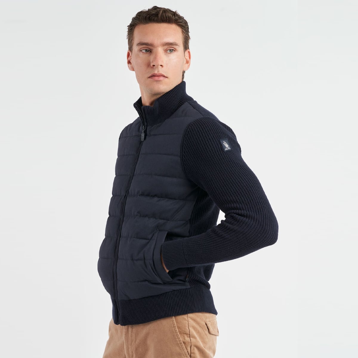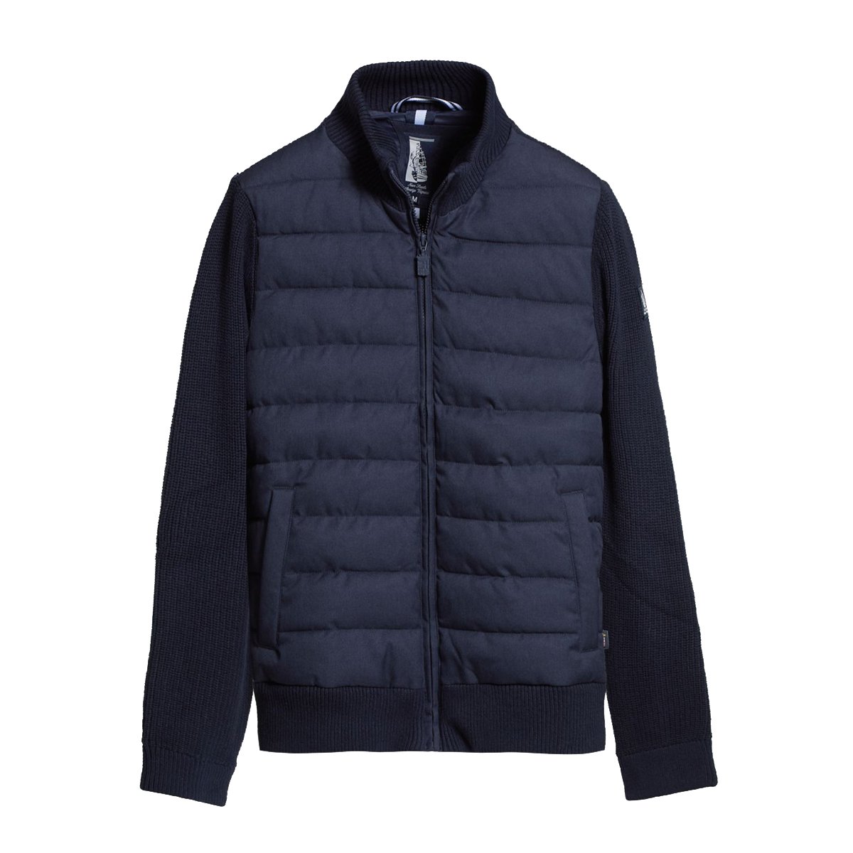 Giubbotto Amerigo Vespucci imbottito Navy Marina Militare, modello in tessuto imbottito e trapuntato frontalmente, il resto in tessuto lavorato a maglia inglese. Mezzo collo rialzato, chiusura full zip e tasche per le mani con bottone a pressione. Patch sulla manica con ricamo del veliero Amerigo Vespucci.