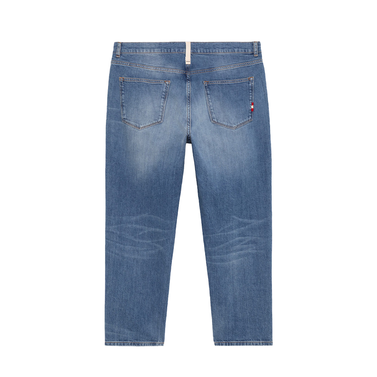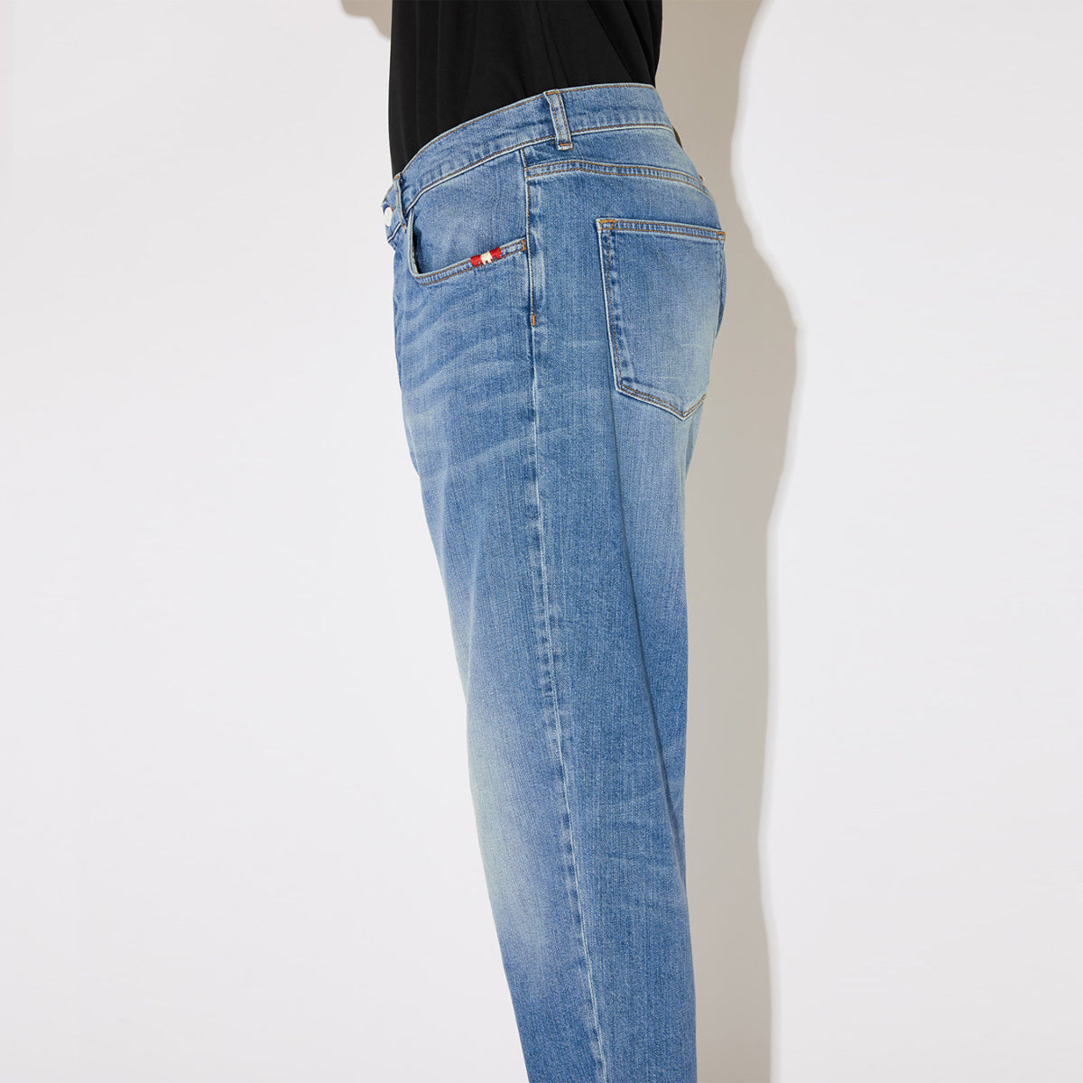 Jeans Jeremiah Slub 2000 Denim Amish, capo carrot fit in denim di cotone con lavaggio medio. Leggere baffature frontale, vita media e iconico passante in tessuto sul retro. Due tasche frontali e due sul retro, chiusura con bottoni.