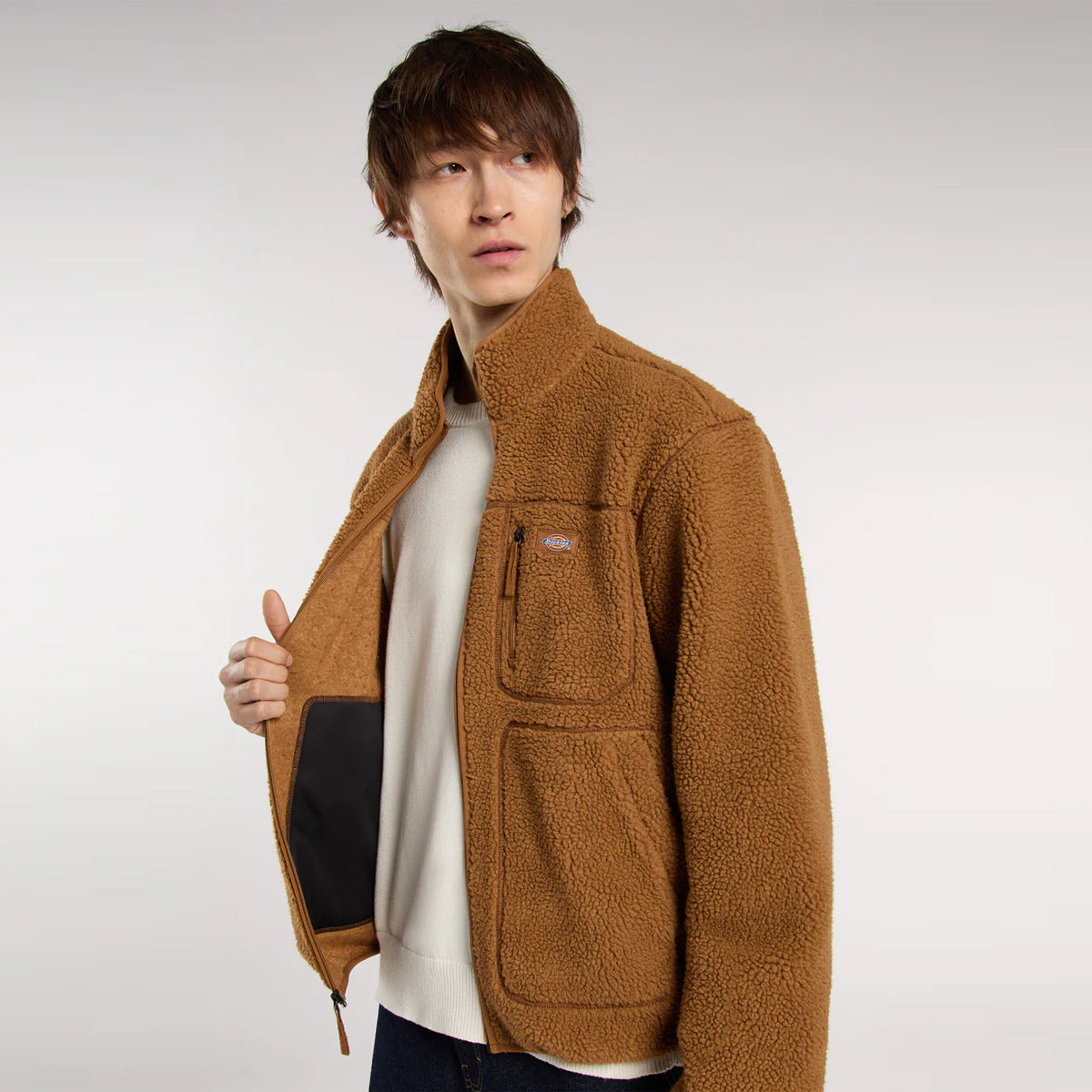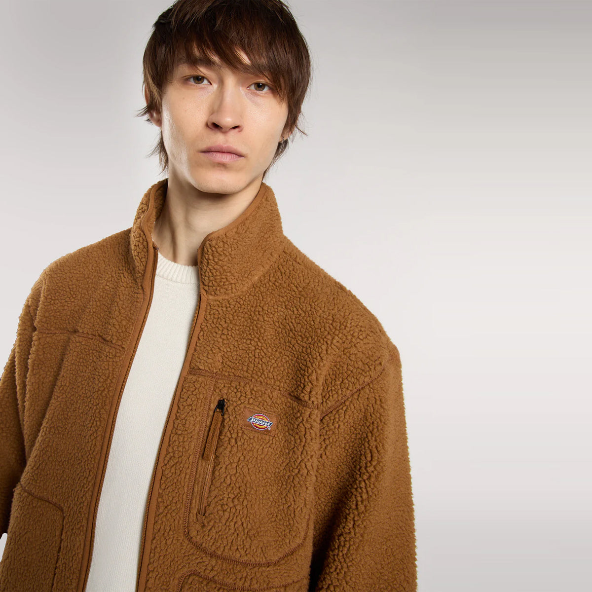 Pile Mount Hope Brown Duck Dickies, soffice pile ideale per proteggerti dal freddo, in tessuto spazzolato effetto bouclé. Collo alto, orli elasticizzati e chiusura integrale con zip. Taschina sul petto e label logata intessuta.