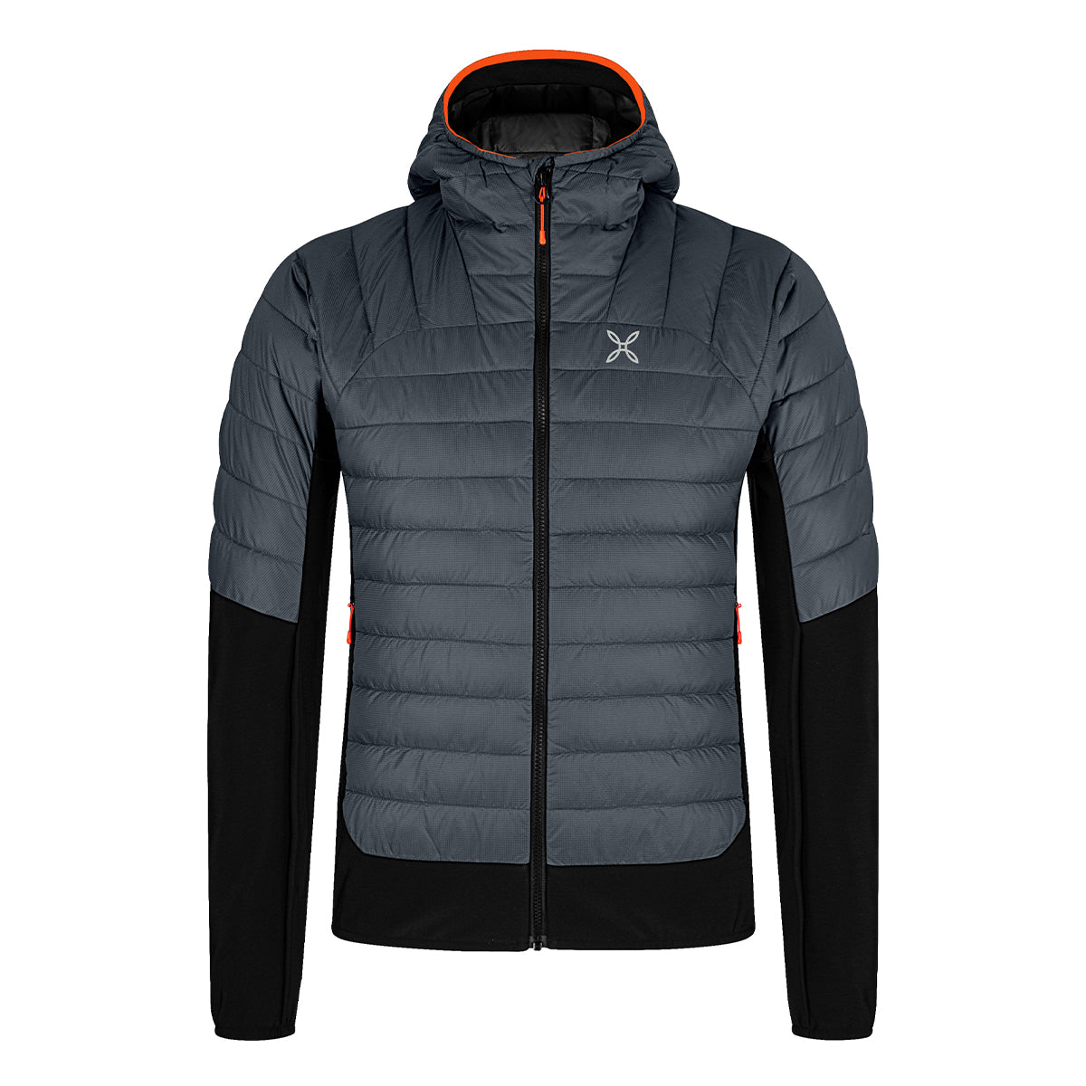 Piumino Peak Hybrid Hooded Piombo Orange Montura, articolo ideale per le tue attività outdoor, in particolare sci e alpinismo. Guscio in poliestere riciclato ultraleggero con inserti in jersey elasticizzato per il massimo del comfort e della produttività. Imbottitura in fibre di PET riciclato. Cappuccio, chiusura con cerniera e logo sul petto. Orlo e polsini elasticizzati.